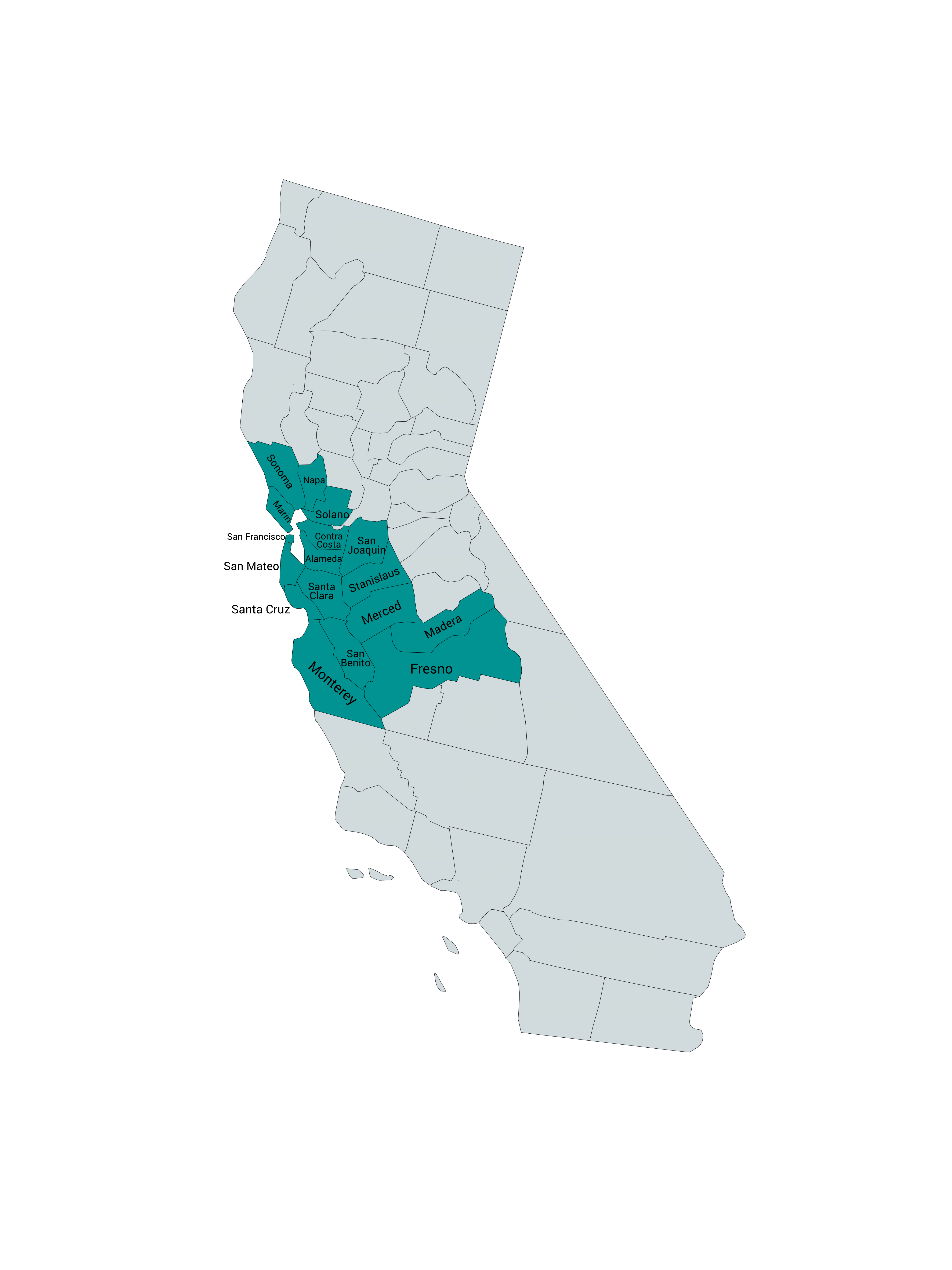 Santa Clara San Francisco AlamedaMarinNapaSolanoContra CostaSan Mateo Santa CruzMonterey San BenitoSan JoaquinStanislausMercedMaderaFresno